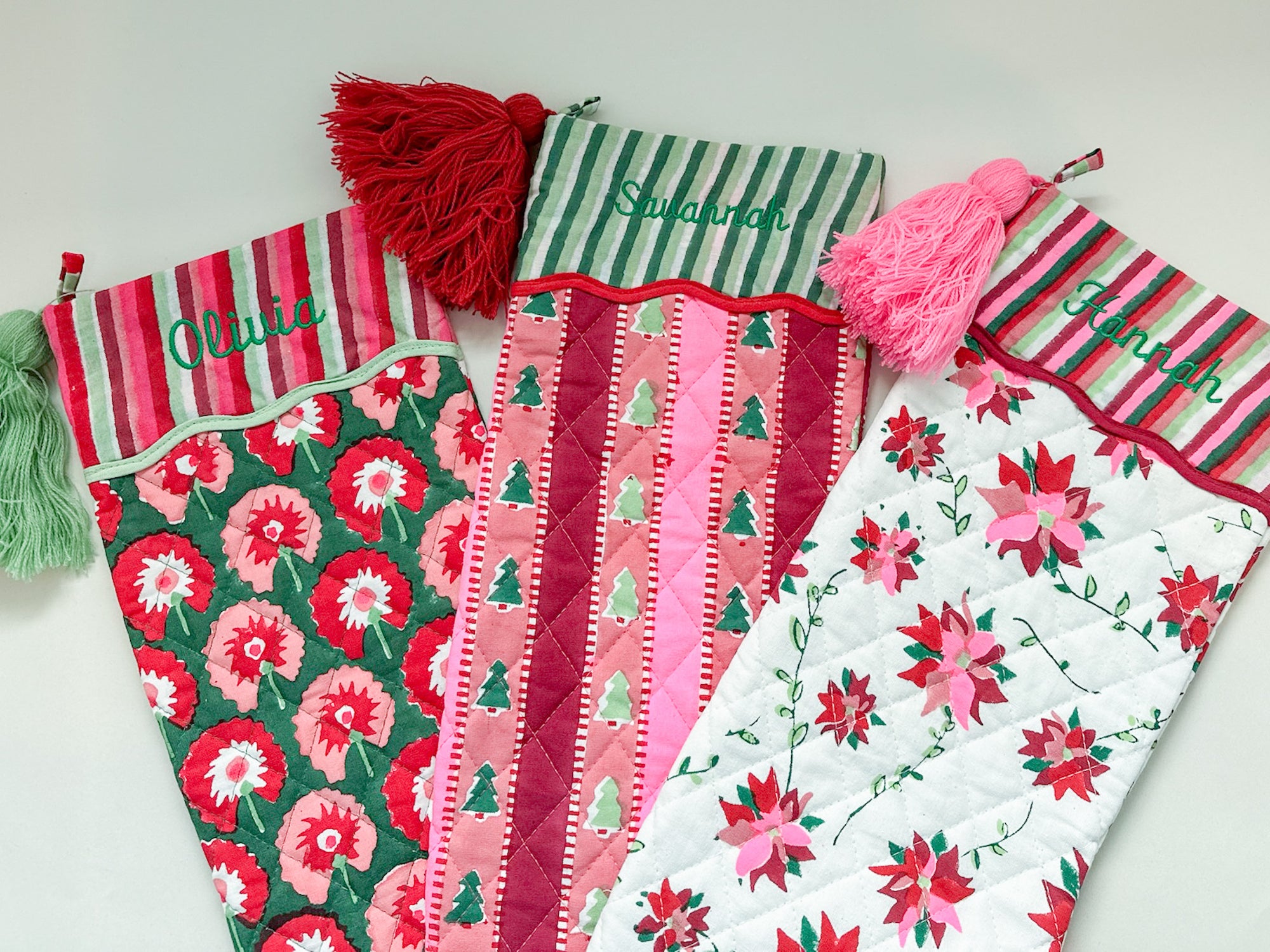 Add some festive flair to your mantel this season with our exclusive blockprint stockings. Handmade in India and decked out with chic trim, tassels, and pom poms, these one-of-a-kind pieces add a luxe layer to your holiday decor.