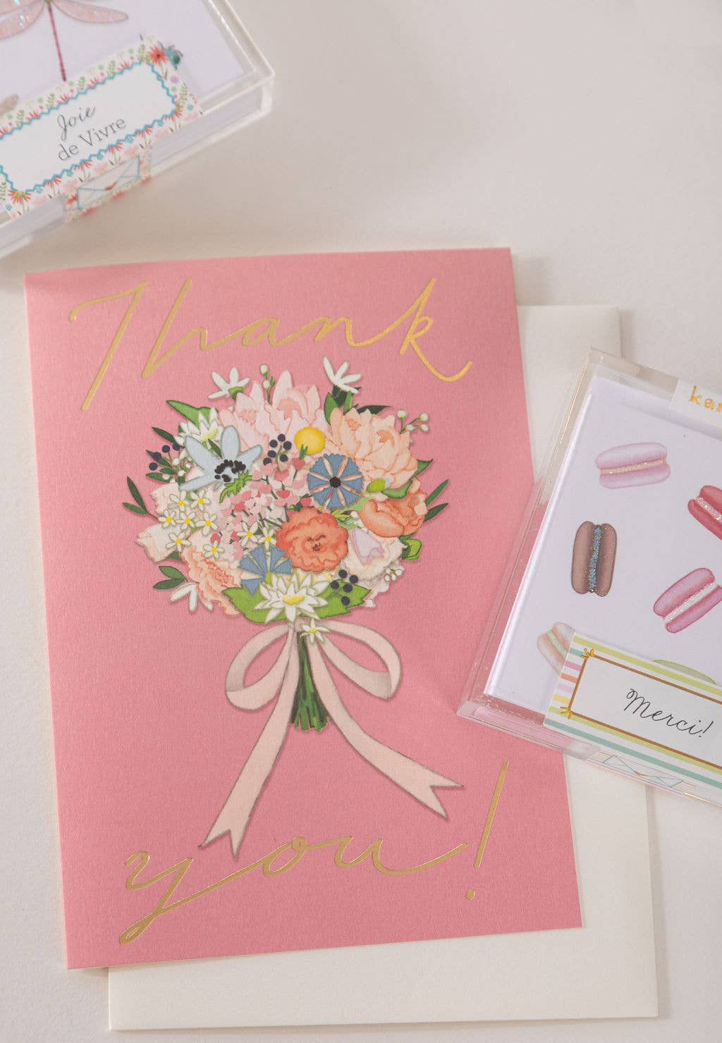 Our thank you bouquet greeting card is printed and foiled in memphis, tn. Full color ink printed on natural white paper, letterpress printed in gold foil and paired with a natural white envelope. Book folded card, blank on the inside.
