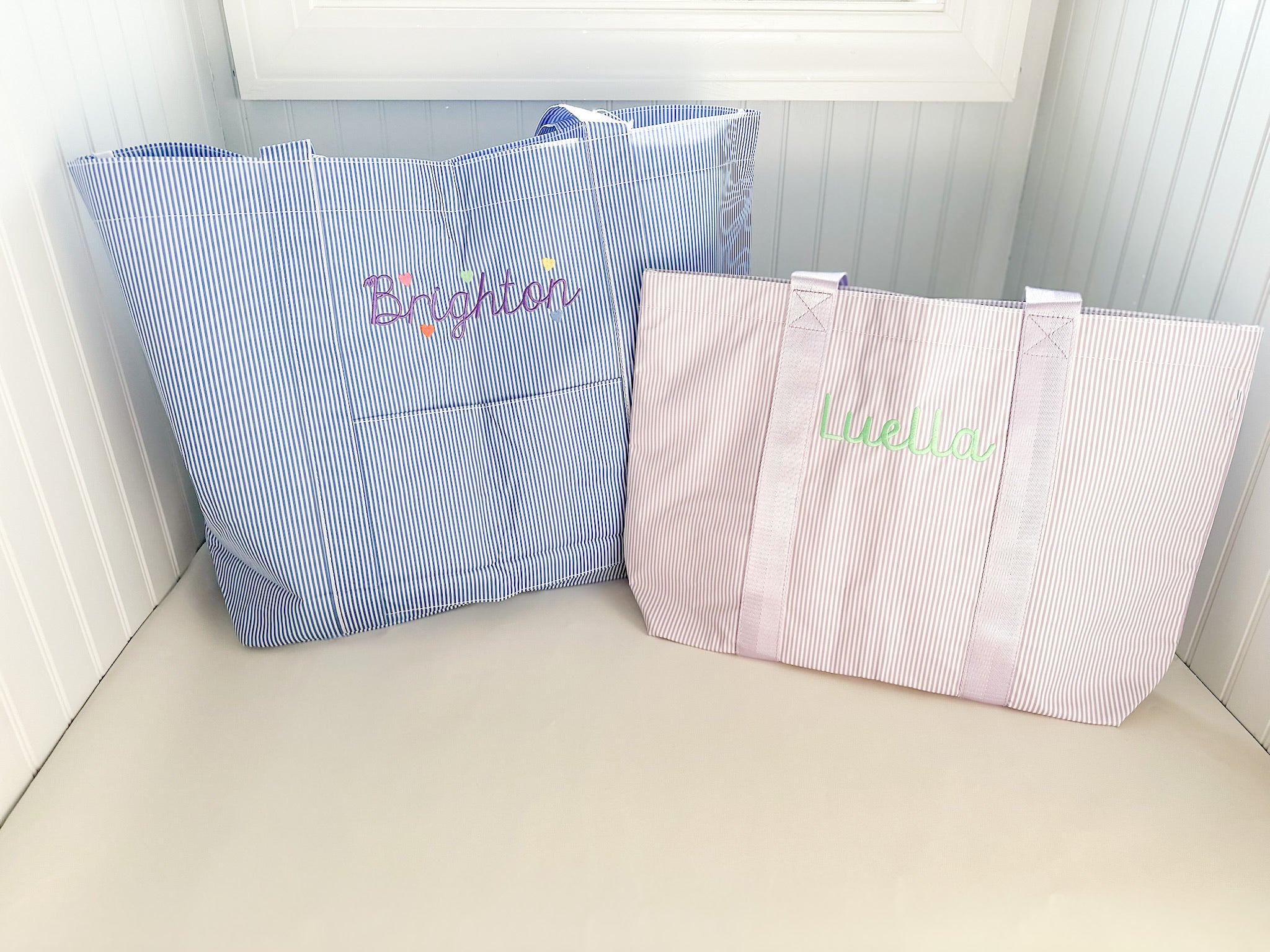 These babies are HUGE - built for the pool, gym, beach, ballpark, you name it. Complete with trolley pocket, multiple exterior pockets, and snap closure. This is the ultimate girl on the go bag.