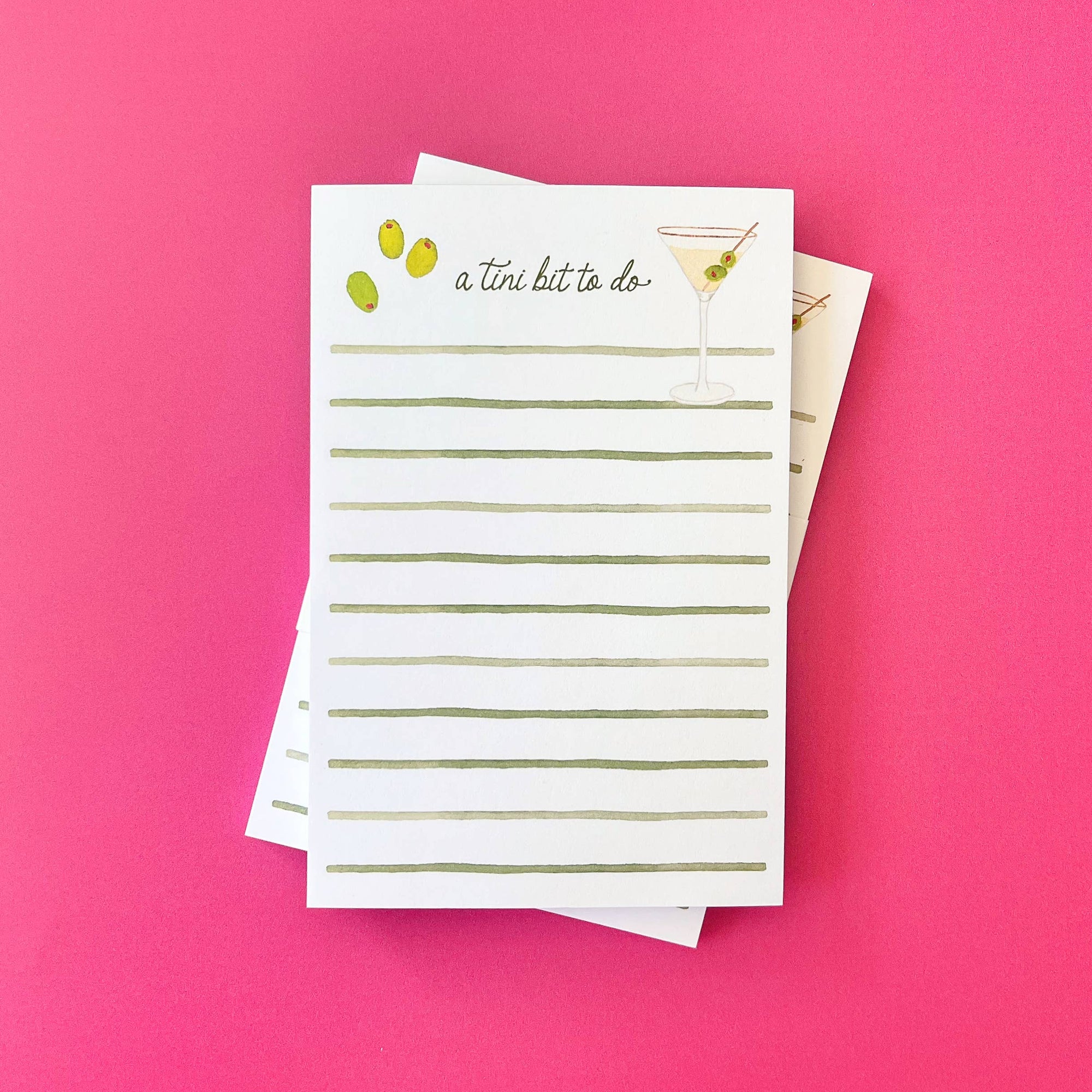 Make your daily lists a little more fun! This 50-sheet 4"x6" notepad features a hand-painted dirty martini and olives with the phrase “a tini bit to do” in a coordinating green script font. Completed with green watercolor lines, it’s perfect for jotting down tasks, shopping lists, or happy hour plans.