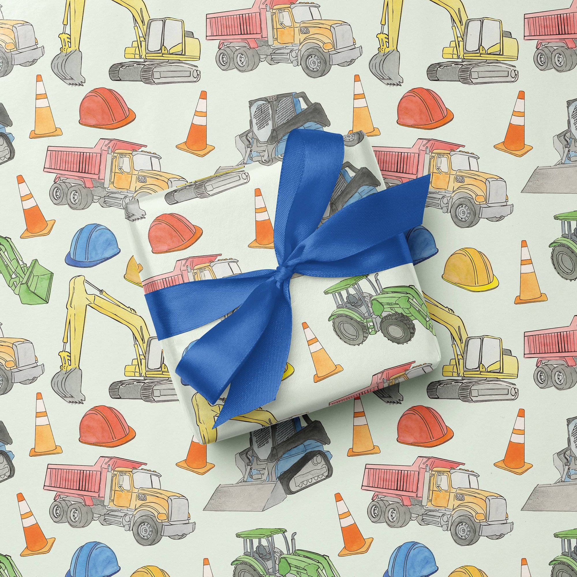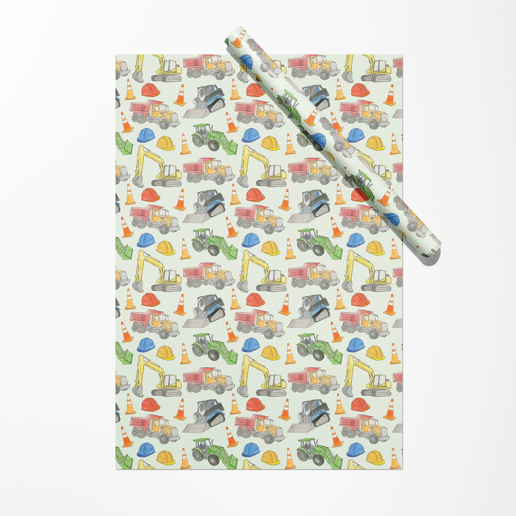 The ultimate gift wrap for little construction fans. Featuring an excavator, skid steer, tractor, and dump truck on a light green background, this design is packed with watercolor-painted construction vehicles ready to dig into the celebration. Bright, fun, and full of energy, it’s perfect for kids and toddlers who love all things trucks and construction.